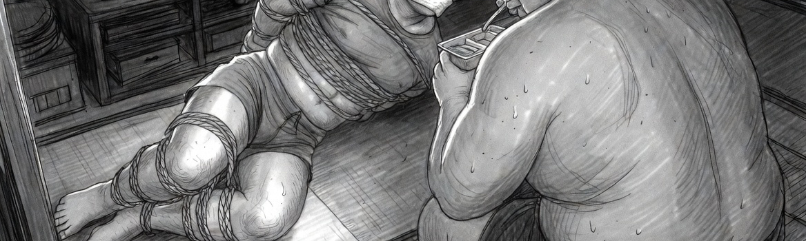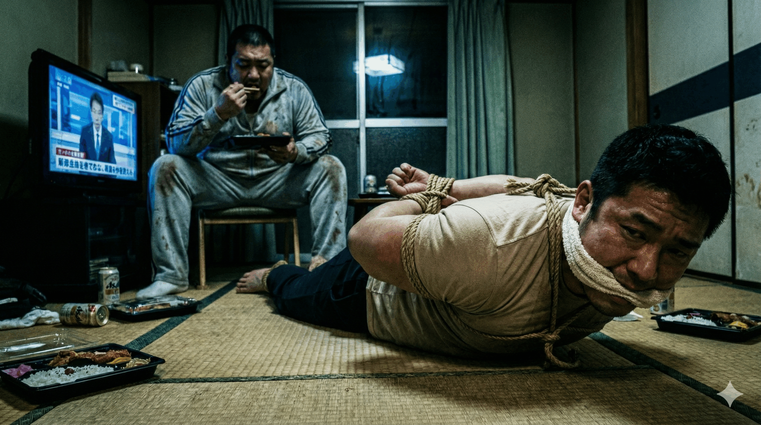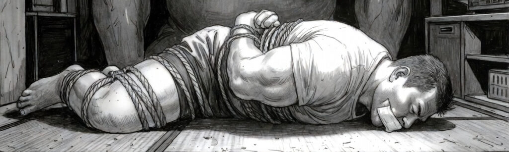 Every time the light from the TV flickers, my massive frame, currently rolled into the corner of the room, casts a long shadow. Five-foot-ten, two hundred and thirty pounds. I’ve built this body with pride as a semi-pro football player, but right now, bound by layer upon layer of rope, it has been reduced to a miserable lump of meat.
